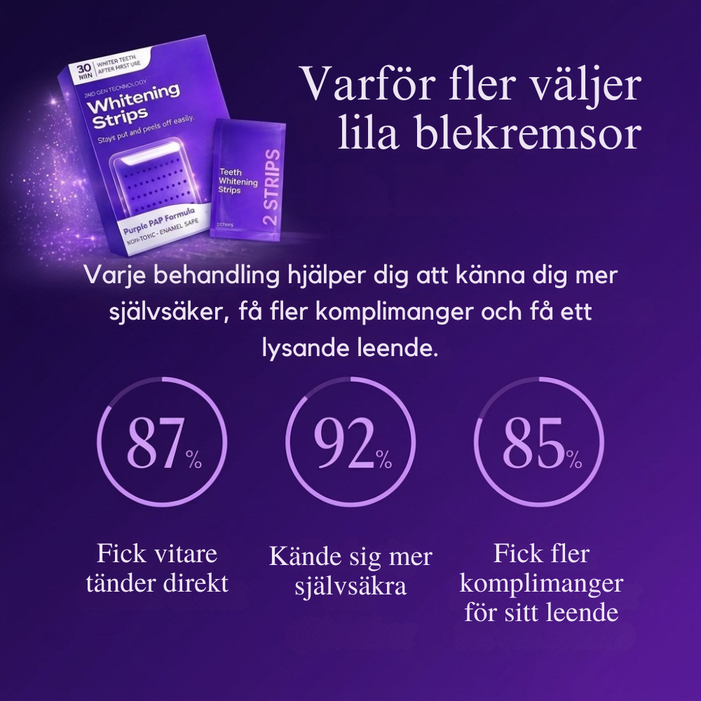 Våra Purple Whitening Strips använder en avancerad formula med väteperoxid och lila PAP som effektivt bryter ner fläckar, samtidigt som mentol ger en fräsch känsla i munnen. Resultatet?
